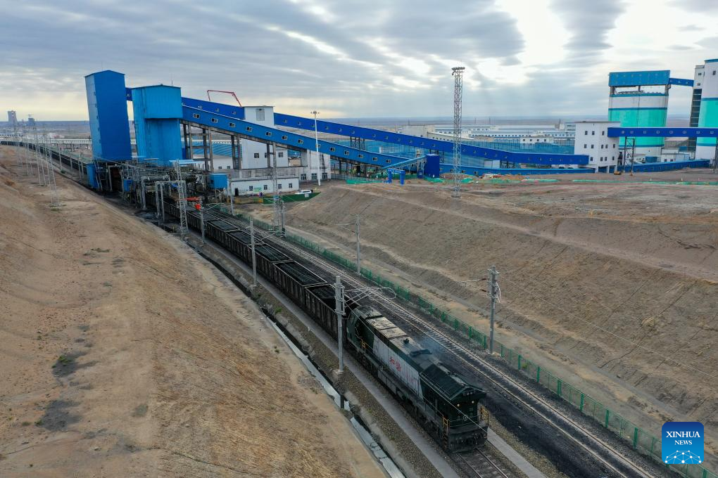 An aerial drone photo taken on Sept. 26, 2024 shows a train loading up with coal at a loading station at the Zhundong open-pit coal mine of Xinjiang Zhundong Energy Co., Ltd of China Energy Group in northwest China's Xinjiang Uygur Autonomous Region. (Xinhua/Ding Lei)