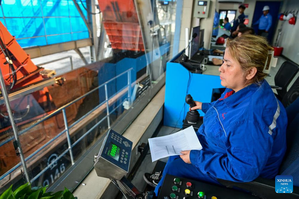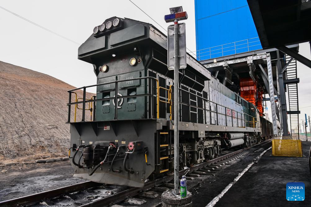 A worker operates a machine to load coal onto a train at the Zhundong open-pit coal mine of Xinjiang Zhundong Energy Co., Ltd of China Energy Group in northwest China's Xinjiang Uygur Autonomous Region, Sept. 27, 2024. (Xinhua/Ding Lei)