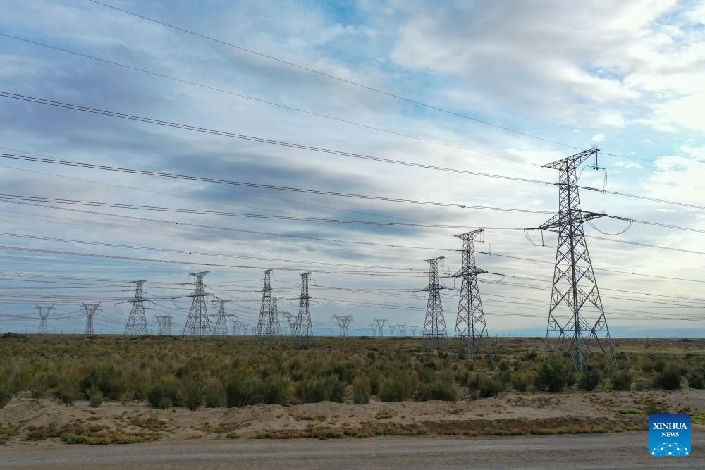 A drone photo taken on Sept. 26, 2024 shows the electricity transmission lines at the Zhundong Economic Technological Development Zone in northwest China's Xinjiang Uygur Autonomous Region. (Xinhua/Ding Lei)