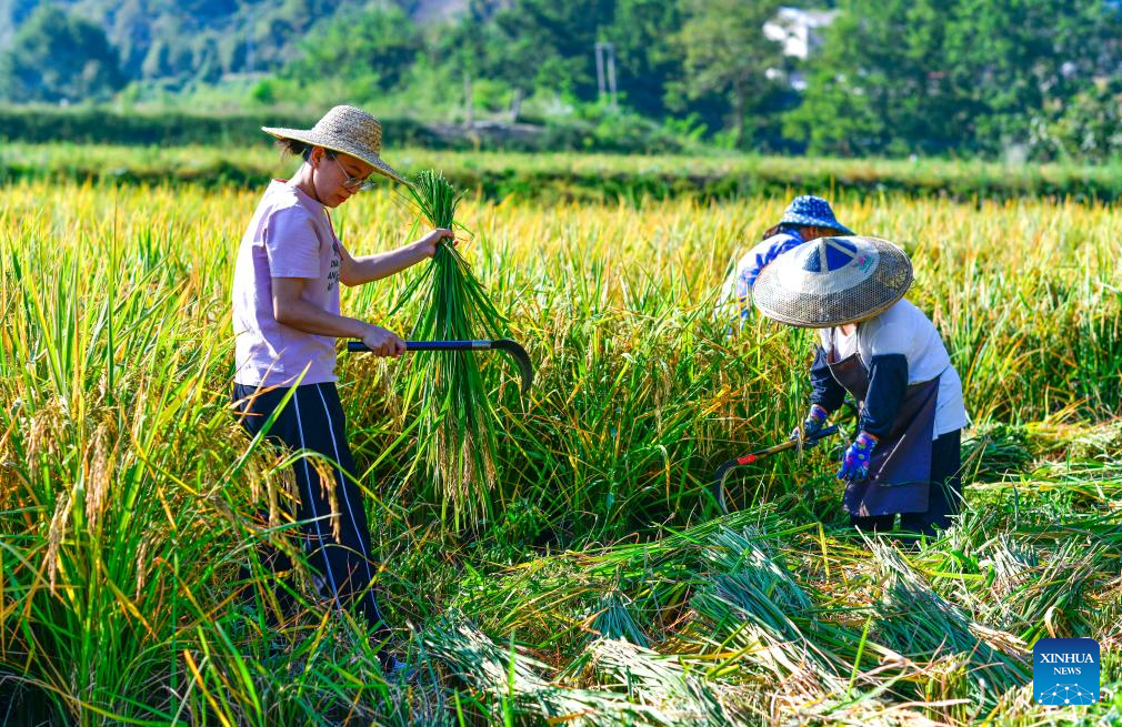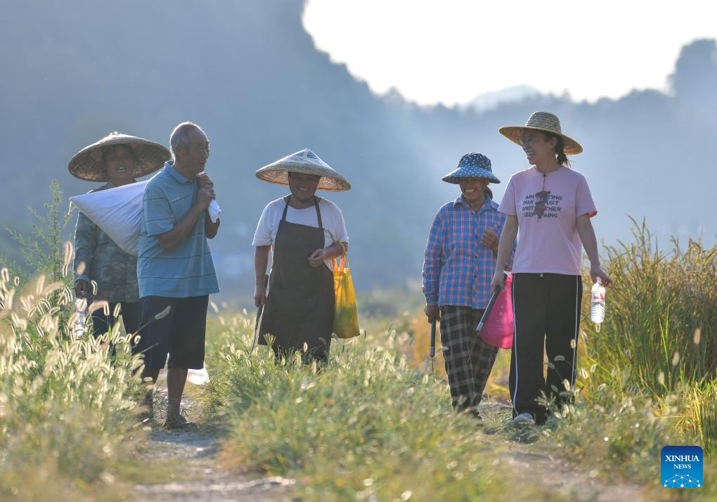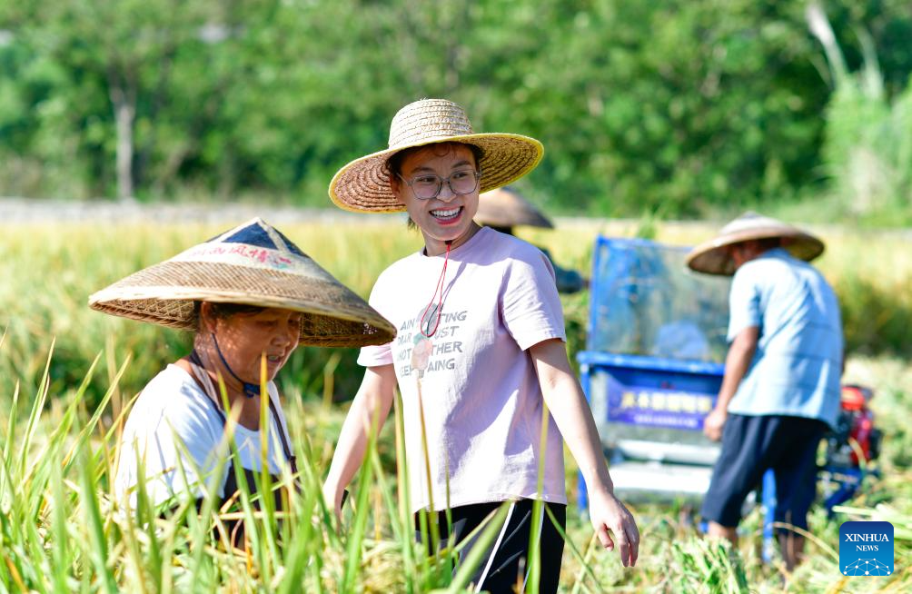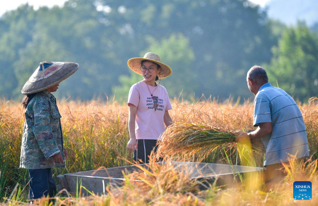 Hou Jiayuan (2nd L) helps villagers harvest rice in Zhouping Village, Cengong County of Qiandongnan Miao and Dong Autonomous Prefecture, southwest China's Guizhou Province, Sept. 25, 2024. (Xinhua/Yang Wenbin)