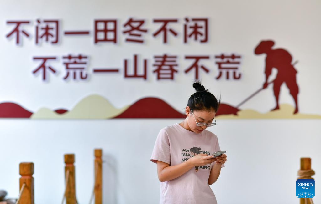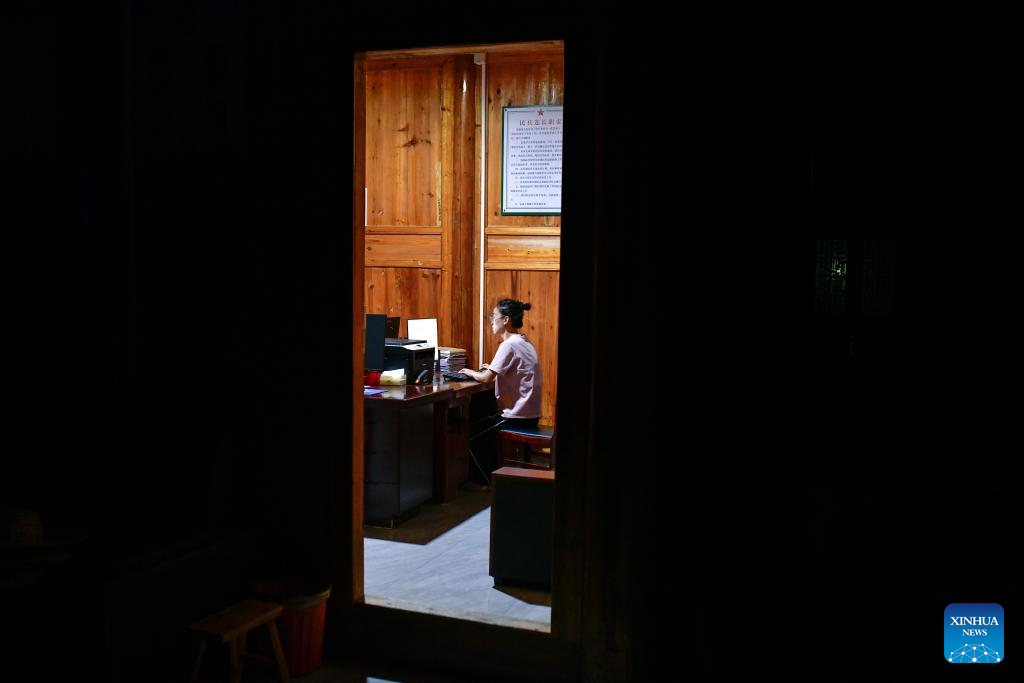 Hou Jiayuan works in her office in Zhouping Village, Cengong County of Qiandongnan Miao and Dong Autonomous Prefecture, southwest China's Guizhou Province, Sept. 25, 2024. (Xinhua/Yang Wenbin)