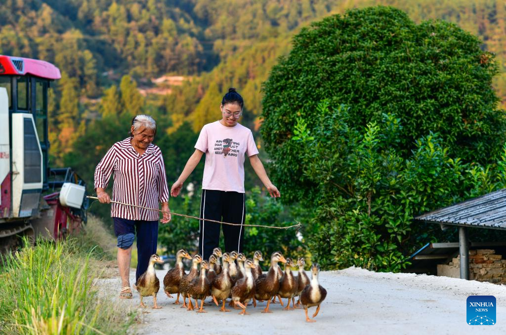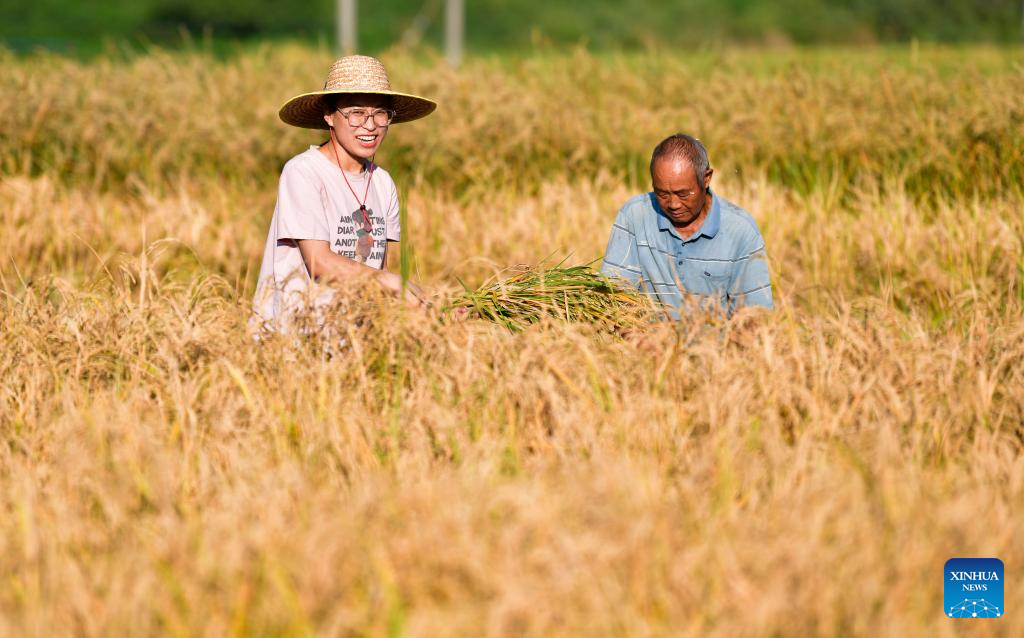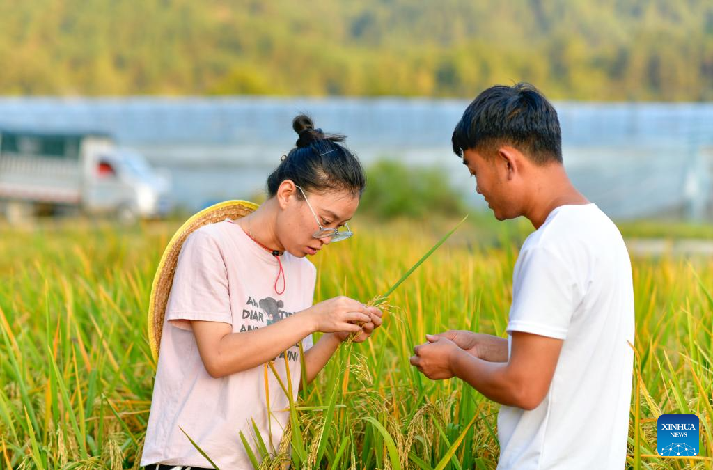 Hou Jiayuan (L) helps villagers harvest rice in Zhouping Village, Cengong County of Qiandongnan Miao and Dong Autonomous Prefecture, southwest China's Guizhou Province, Sept. 25, 2024. (Xinhua/Yang Wenbin)