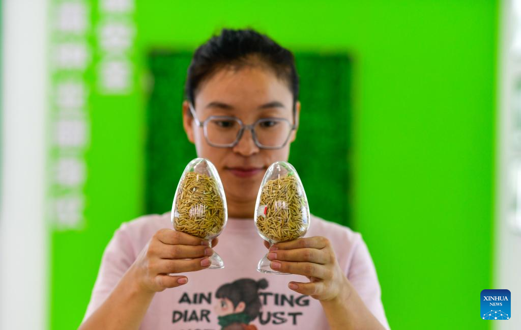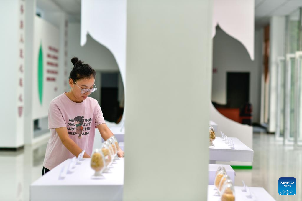 Hou Jiayuan checks the seed storage at the hybrid rice seed R&D and testing center in Zhouping Village, Cengong County of Qiandongnan Miao and Dong Autonomous Prefecture, southwest China's Guizhou Province, Sept. 25, 2024. (Xinhua/Yang Wenbin)