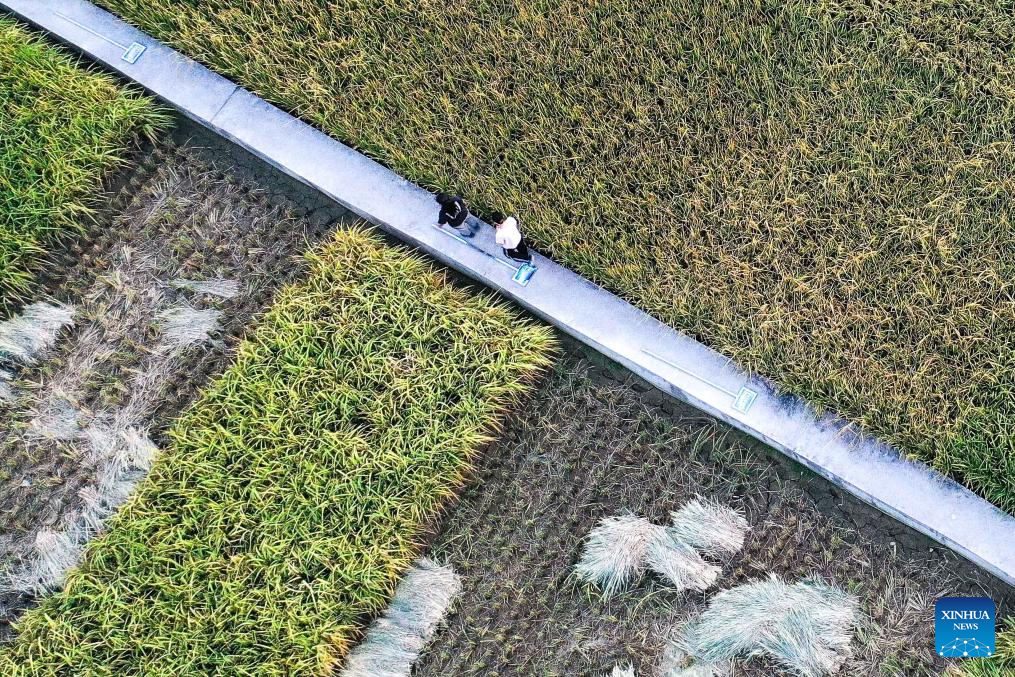 An aerial drone photo shows Hou Jiayuan (R) doing field research at a hybrid rice seed production base in Zhouping Village, Cengong County of Qiandongnan Miao and Dong Autonomous Prefecture, southwest China's Guizhou Province, Sept. 25, 2024. (Xinhua/Yang Wenbin)
