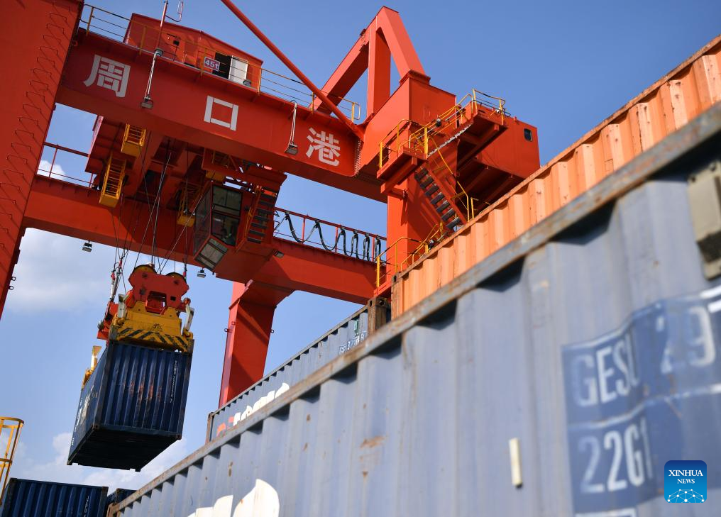 A container is lifted at Zhoukou Central Port in Zhoukou, central China's Henan Province, June 28, 2022.?(Xinhua/Li Jianan)