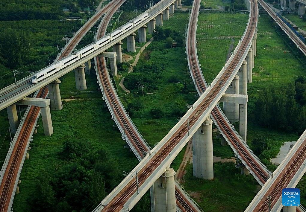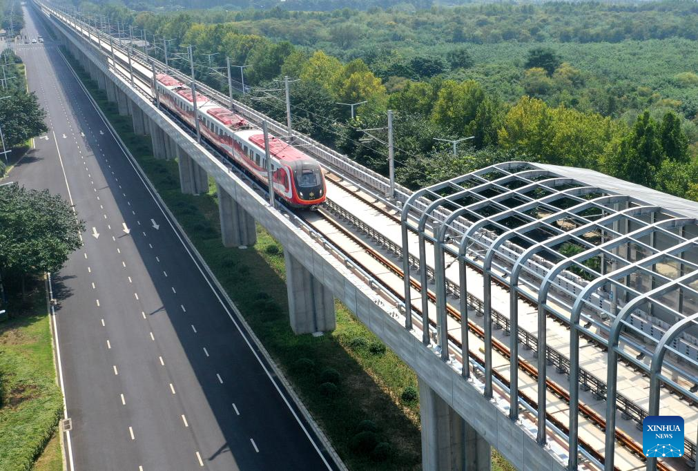 A drone photo shows an inter-city train in trial operation in Xuchang City, central China's Henan Province, Sept. 8, 2022.?(Xinhua/Li Jianan)