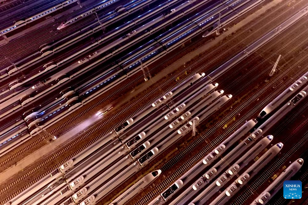 An aerial drone photo shows bullet trains at a train depot in Zhengzhou, central China's Henan Province, Sept. 6, 2016. (Xinhua/Li An)