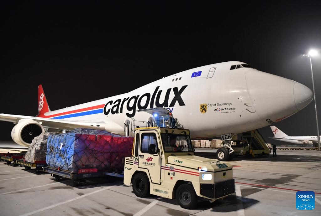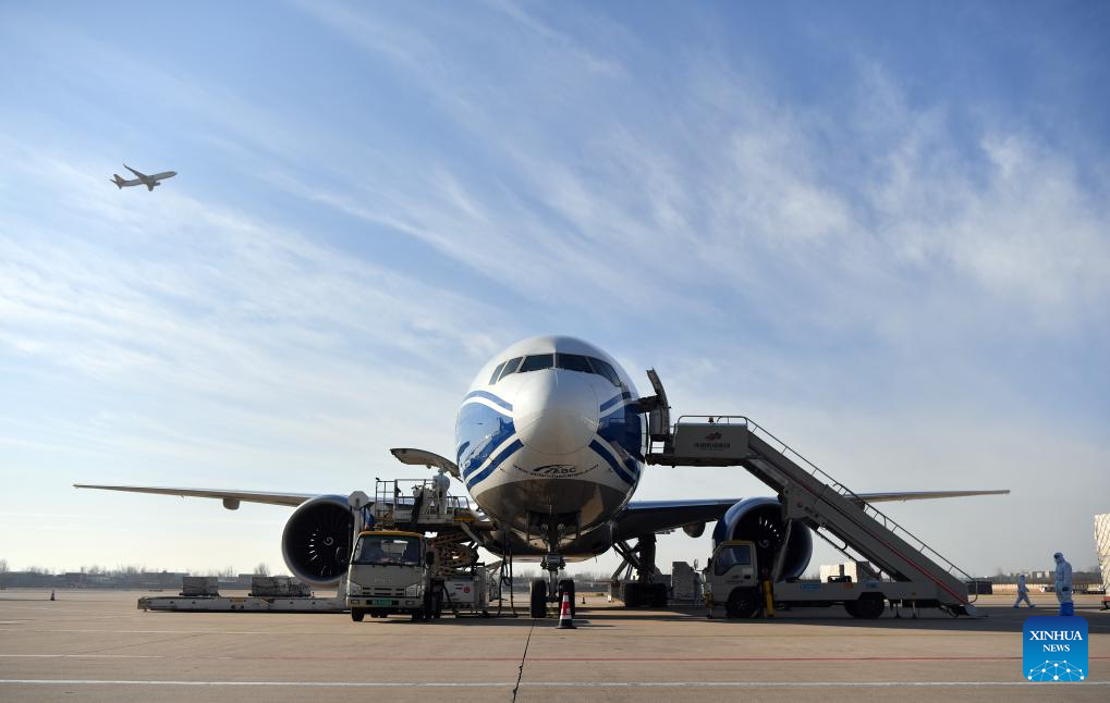 Airport staff members load a cargo plane at Xinzheng International Airport in Zhengzhou, central China's Henan Province, Dec. 30, 2021.?(Xinhua/Li Jianan)