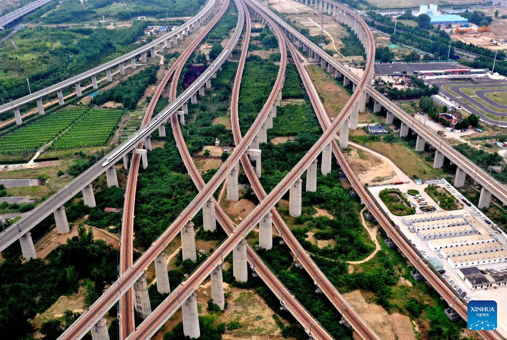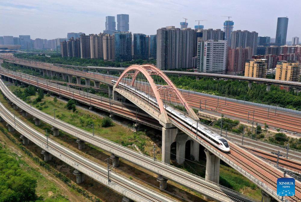 An aerial drone photo shows a bullet train running on a bridge in Zhengzhou, central China's Henan Province, May 30, 2024.?(Xinhua/Li An)