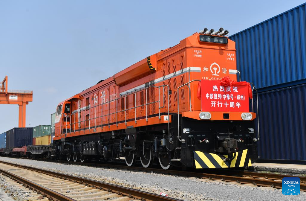A China-Europe freight train is pictured at Putian Station in Zhengzhou, capital of central China's Henan Province, July 18, 2023.?(Xinhua/Li Jianan)