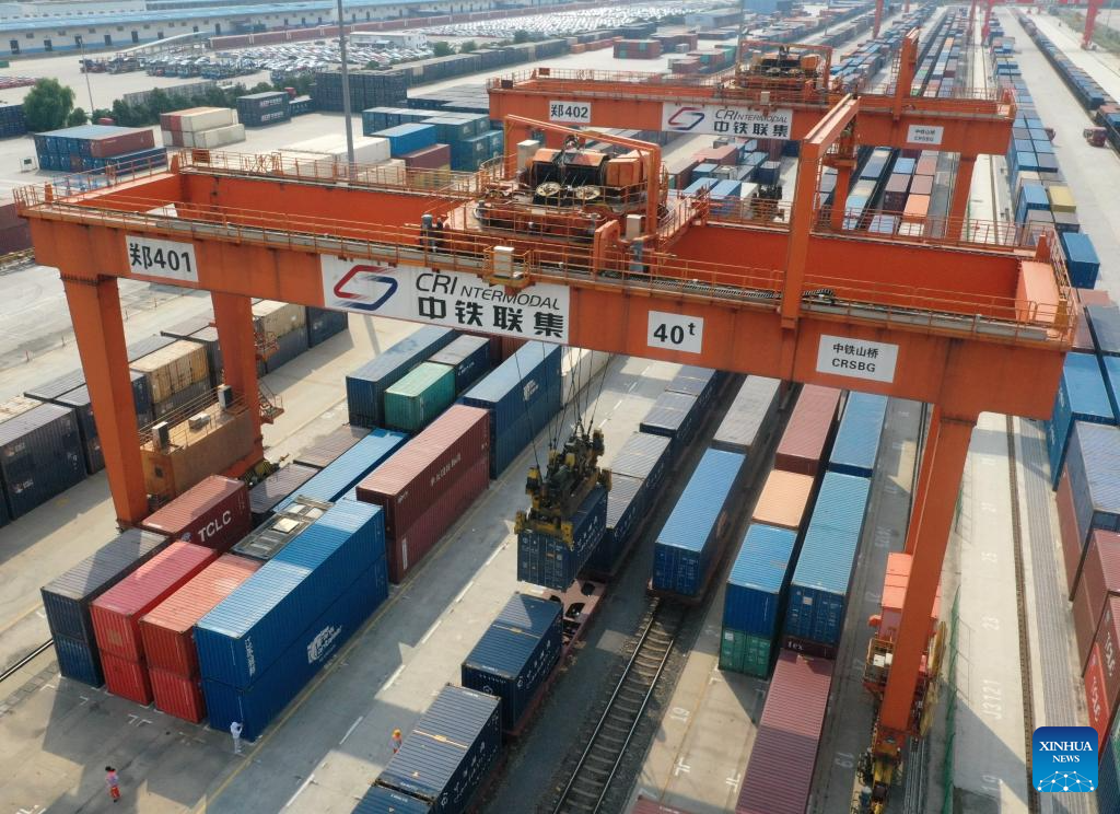 A drone photo shows a container being lifted at Zhoukou Central Port in Zhoukou, central China's Henan Province, Sept. 17, 2023.?(Xinhua/Li Jianan)