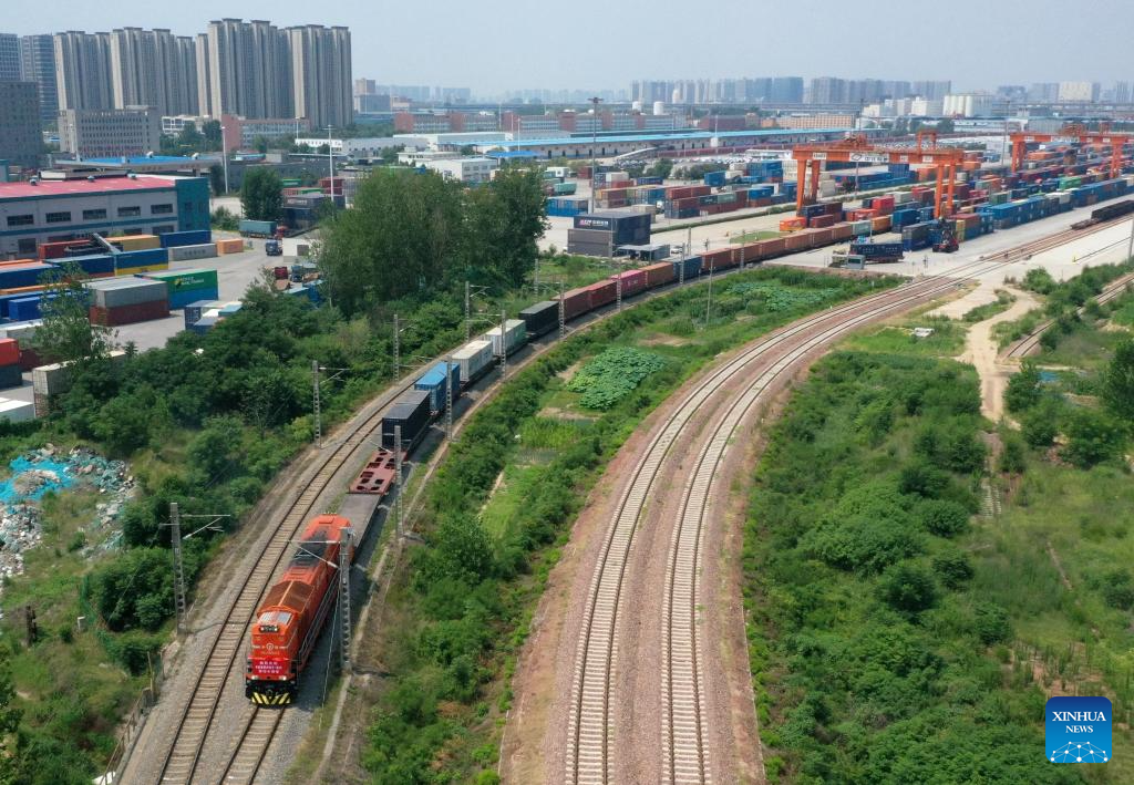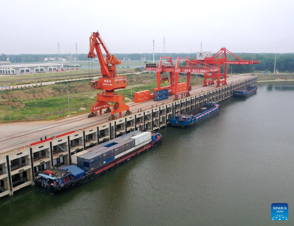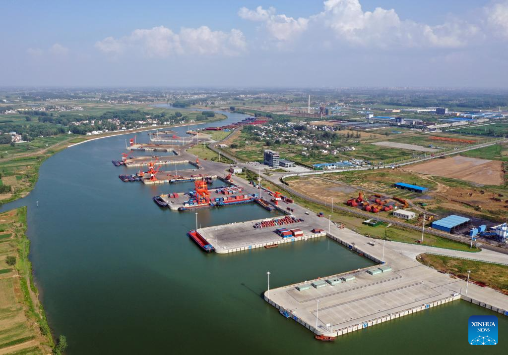 An aerial drone photo shows Zhoukou Central Port in Zhoukou, central China's Henan Province, June 28, 2022.?(Xinhua/Li Jianan)