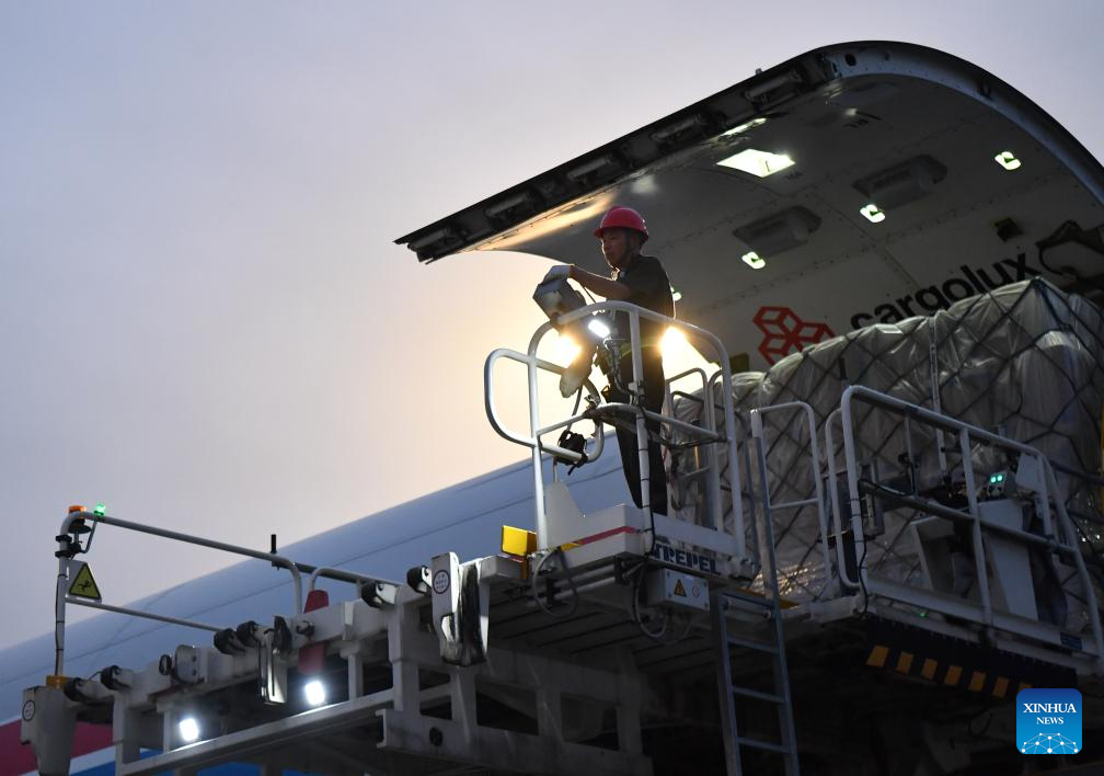 Airport staff members unload a cargo plane at Xinzheng International Airport in Zhengzhou, central China's Henan Province, Aug. 1, 2023.?(Xinhua/Li Jianan)