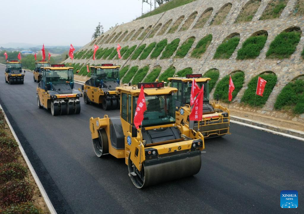 A drone photo shows unmanned road rollers operating at a section of an expressway along the Dabie Mountains in central China's Henan Province, April 11, 2024.?(Xinhua/Li Jianan)