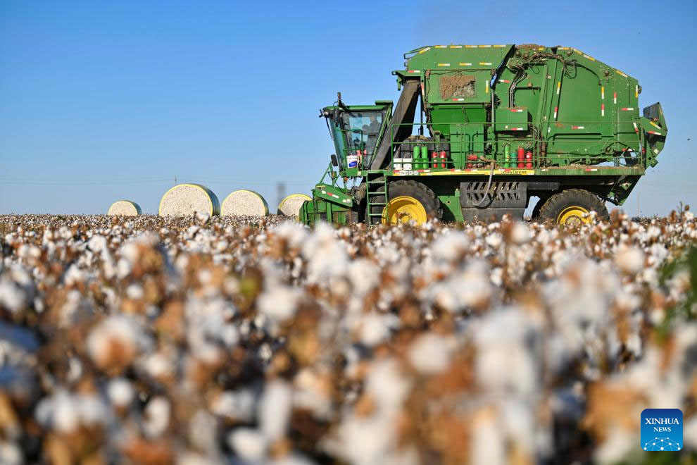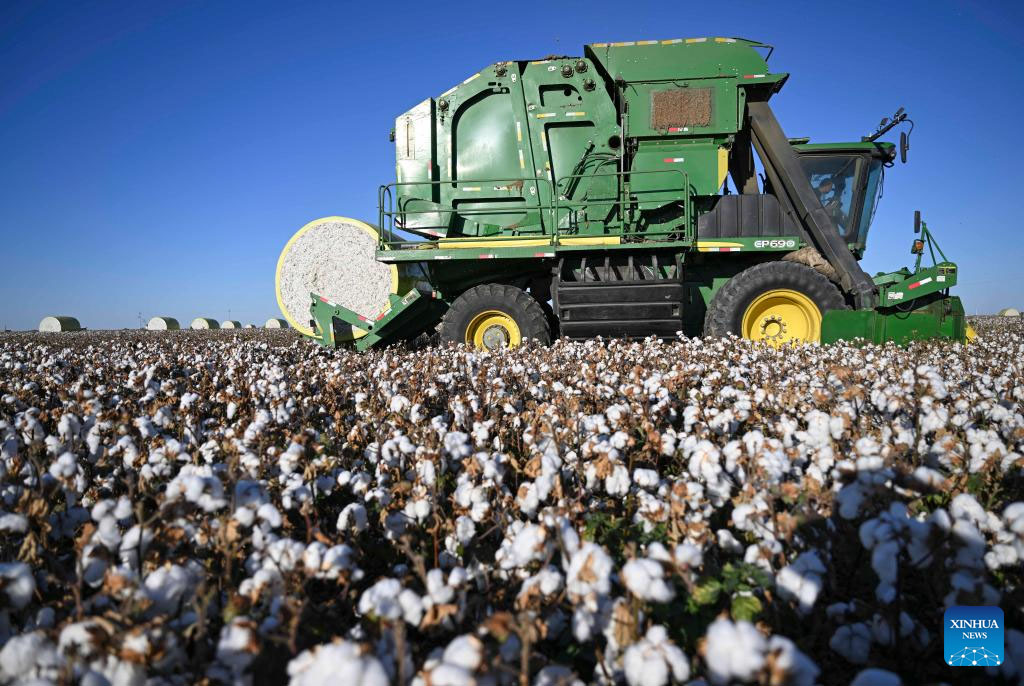 A cotton picker works in a cotton field in Wujiaqu City, northwest China's Xinjiang Uygur Autonomous Region, Sept. 29, 2024. The vast cotton fields of Xinjiang have entered the harvest season this year. (Xinhua/Hu Huhu)