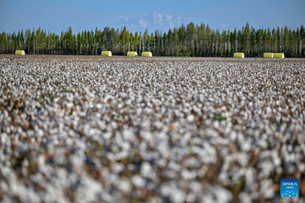 This photo taken on Sept. 29, 2024 shows the cotton fields in Wujiaqu City, northwest China's Xinjiang Uygur Autonomous Region. The vast cotton fields of Xinjiang have entered the harvest season this year. (Xinhua/Hu Huhu)