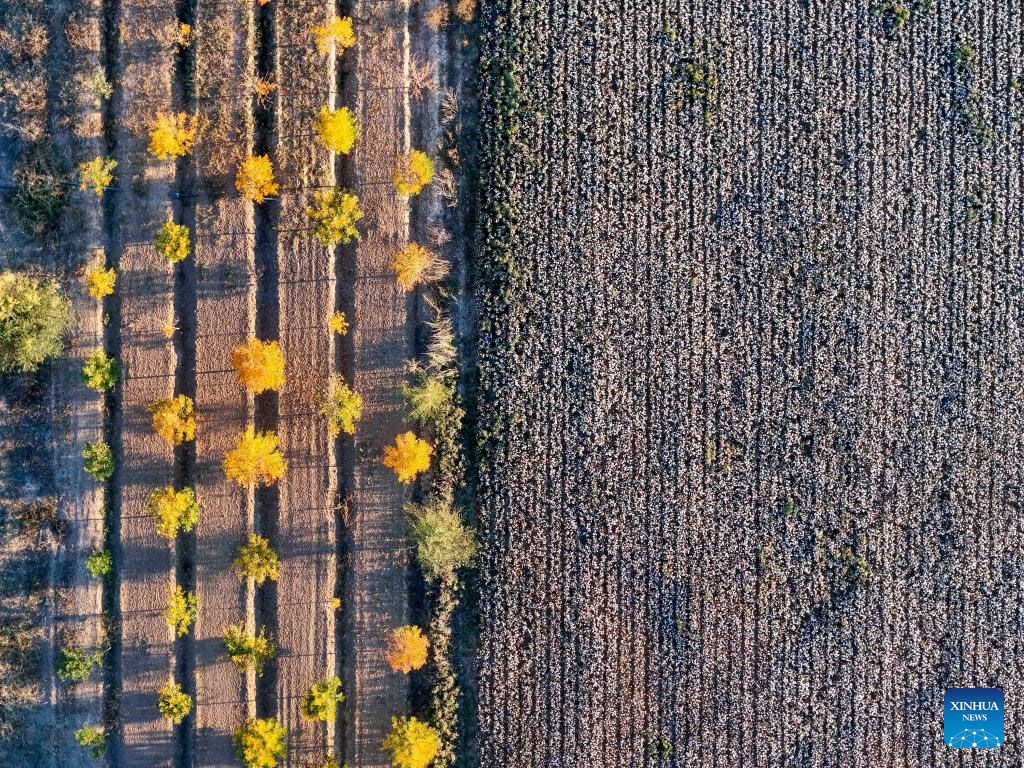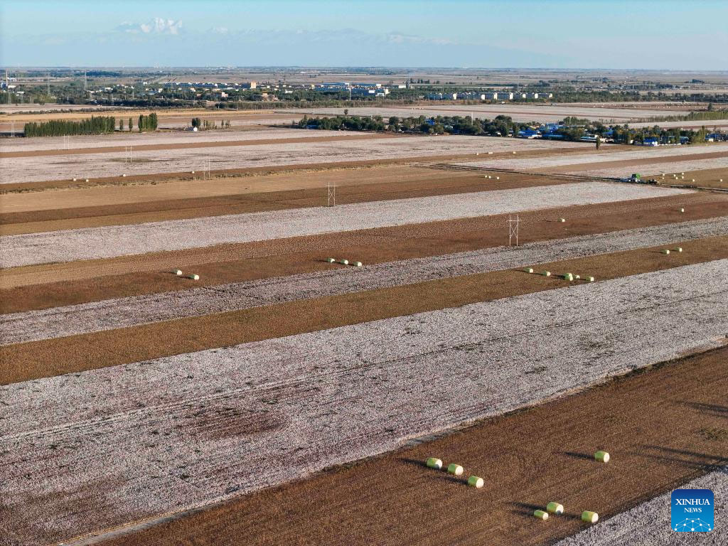 An aerial drone photo taken on Sept. 29, 2024 shows the cotton fields in Wujiaqu City, northwest China's Xinjiang Uygur Autonomous Region. The vast cotton fields of Xinjiang have entered the harvest season this year. (Xinhua/Hu Huhu)