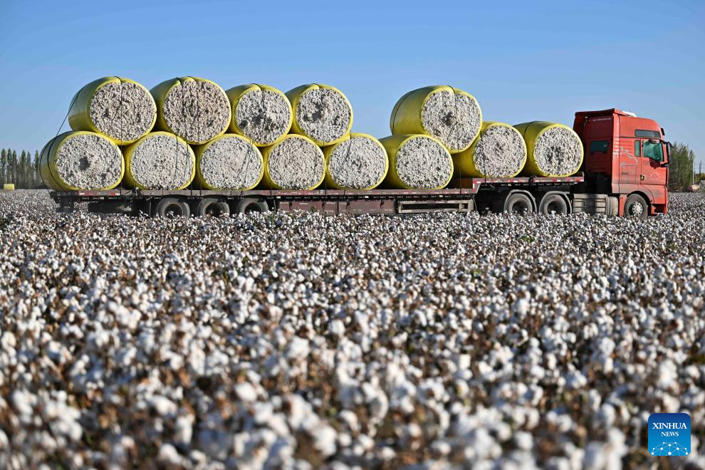This photo taken on Sept. 29, 2024 shows a truck loaded with harvested cotton running along the cotton fields in Wujiaqu City, northwest China's Xinjiang Uygur Autonomous Region. The vast cotton fields of Xinjiang have entered the harvest season this year. (Xinhua/Hu Huhu)