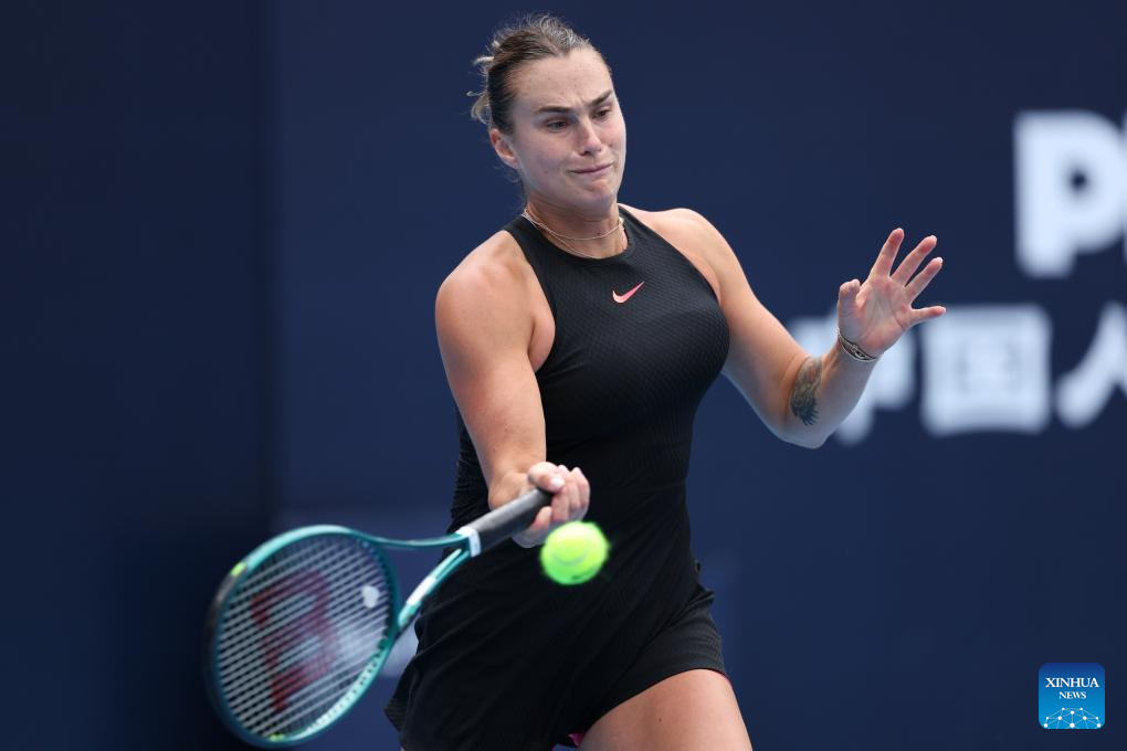 Aryna Sabalenka of Belarus hits a return during the women's singles third round match against Ashlyn Krueger of the United States at 2024 China Open tennis tournament in Beijing, capital of China, Sept. 30, 2024. (Xinhua/Zhang Chenlin)