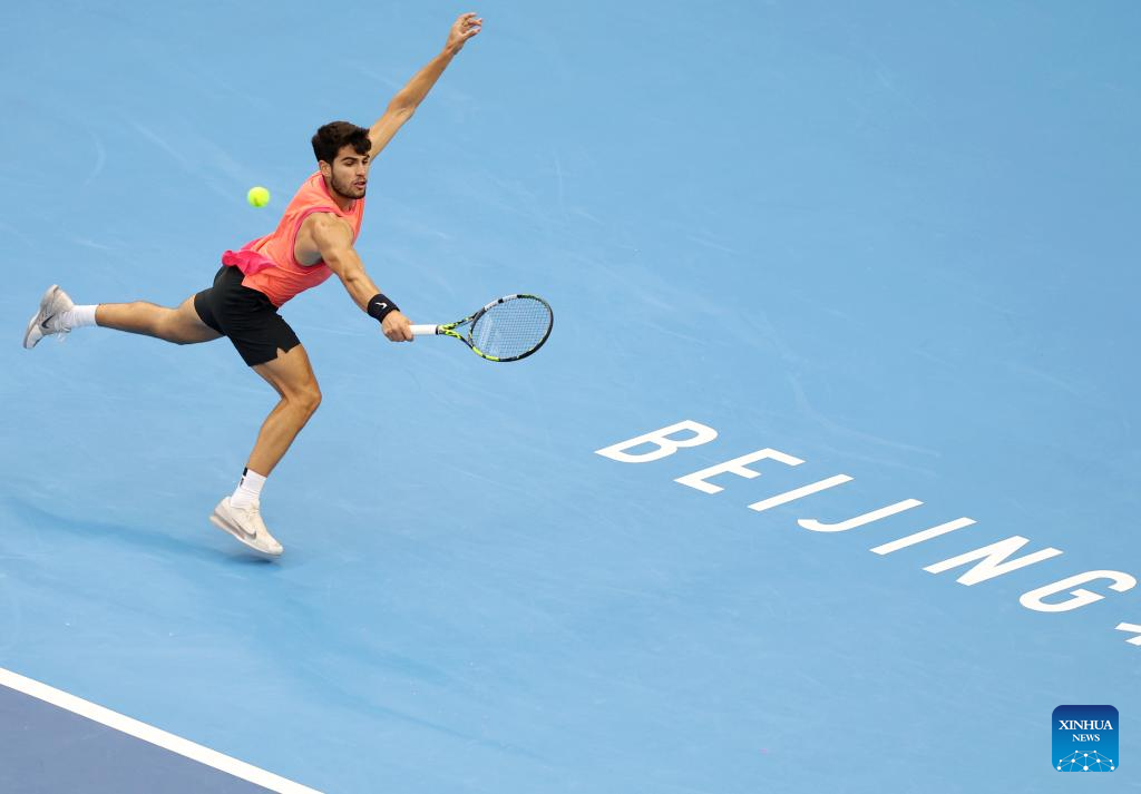 Carlos Alcaraz of Spain competes during the men's singles quarterfinals against Karen Khachanov of Russia at 2024 China Open tennis tournament in Beijing, capital of China, Sept. 30, 2024. (Xinhua/Zhang Chenlin)