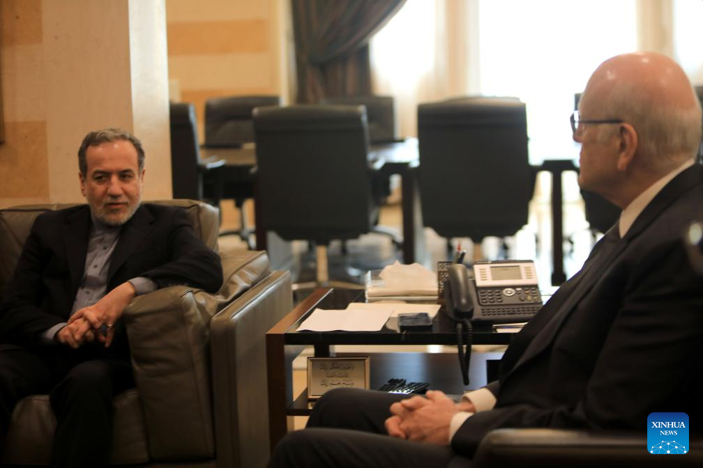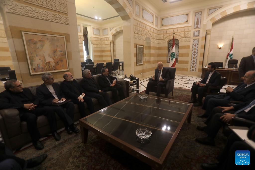 Iranian Foreign Minister Seyyed Abbas Araghchi meets with Lebanese Prime Minister Najib Mikati (not in the picture) in Beirut, Lebanon, on Oct. 4, 2024. Iran's Foreign Minister Seyyed Abbas Araghchi affirmed Friday that his country will stand with Hezbollah and always support Lebanon and its people. (Xinhua/Bilal Jawich)