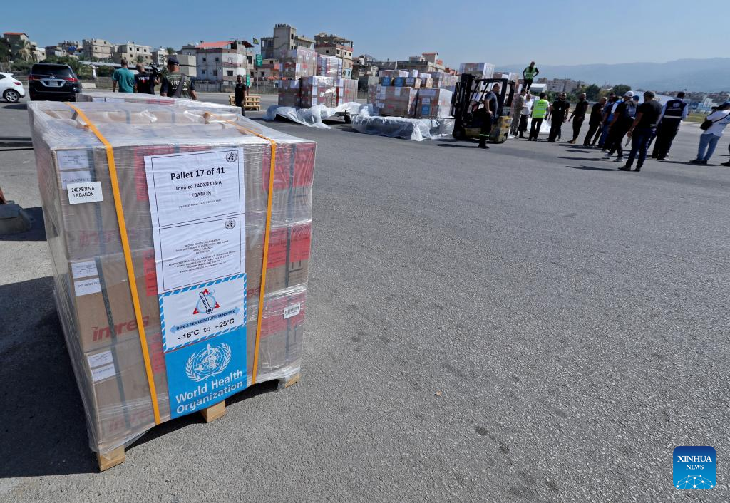 Aid provided by the World Health Organization (WHO) and the United Nations High Commissioner for Refugees (UNHCR) is unloaded at an airport in Beirut, Lebanon, on Oct. 4, 2024. An aid plane carrying 55 tons of aid and medical supplies arrived Friday in Lebanon from the United Arab Emirates, the National News Agency (NNA) reported. This aid was provided by the World Health Organization (WHO) and the United Nations High Commissioner for Refugees (UNHCR), said the report. (Xinhua/Bilal Jawich)