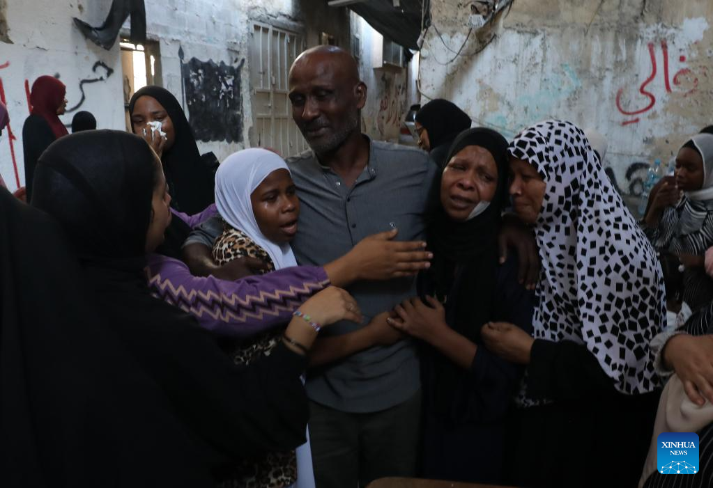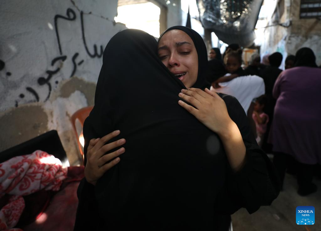 People comfort each other during a funeral for victims killed in an Israeli airstrike in the Tulkarm refugee camp, northern West Bank, on Oct. 4, 2024. At least 18 Palestinians were killed and many others wounded in an Israeli airstrike targeting the Tulkarm refugee camp in the northern West Bank on Thursday, the Palestinian Ministry of Health said in a brief statement. (Photo by Nidal Eshtayeh/Xinhua)