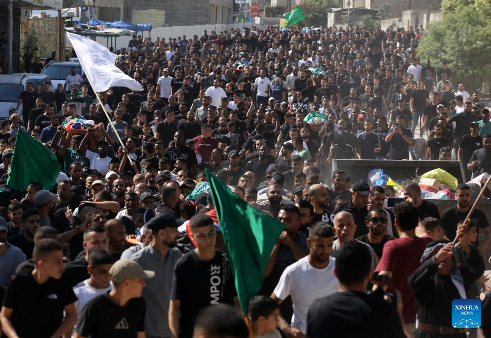 People attend a funeral for victims killed in an Israeli airstrike in the Tulkarm refugee camp, northern West Bank, on Oct. 4, 2024. At least 18 Palestinians were killed and many others wounded in an Israeli airstrike targeting the Tulkarm refugee camp in the northern West Bank on Thursday, the Palestinian Ministry of Health said in a brief statement. (Photo by Nidal Eshtayeh/Xinhua)