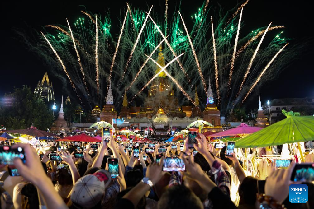 People enjoy fireworks in Jinghong City, Xishuangbanna Dai Autonomous Prefecture, southwest China's Yunnan Province, Oct. 4, 2024. During the week-long National Day holiday starting on Oct. 1, Chinese people take a break to travel and enjoy leisure activities. Travel and holiday consumption have continued to boom, mirroring the vitality of Chinese economy. (Photo by Li Yunsheng/Xinhua)