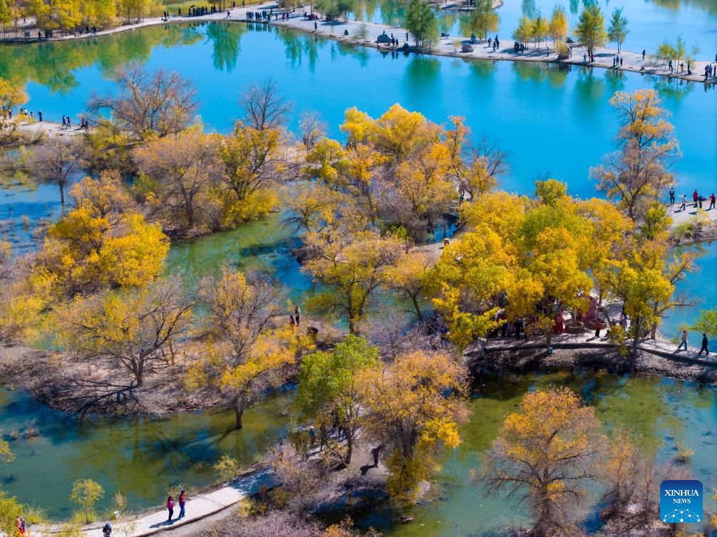 People view the scenery of desert poplar (populus euphratica) forest at a scenic spot in Jiuquan, northwest China's Gansu Province, Oct. 4, 2024. During the week-long National Day holiday starting on Oct. 1, Chinese people take a break to travel and enjoy leisure activities. Travel and holiday consumption have continued to boom, mirroring the vitality of Chinese economy. (Photo by Gao Hongshan/Xinhua)
