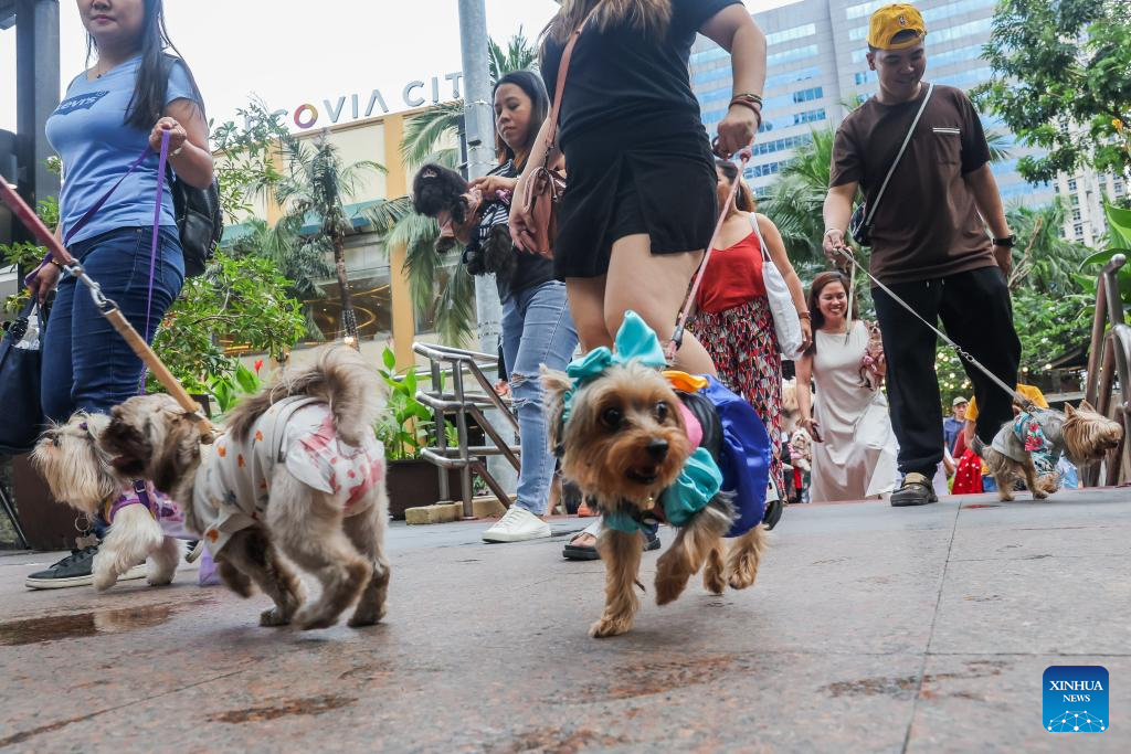 People and their costumed pet animals participate in a pet parade in Quezon City, the Philippines on Oct. 6, 2024. The pet parade was organized in celebration of the World Animal Day which is observed on Oct. 4 every year. (Xinhua/Rouelle Umali)