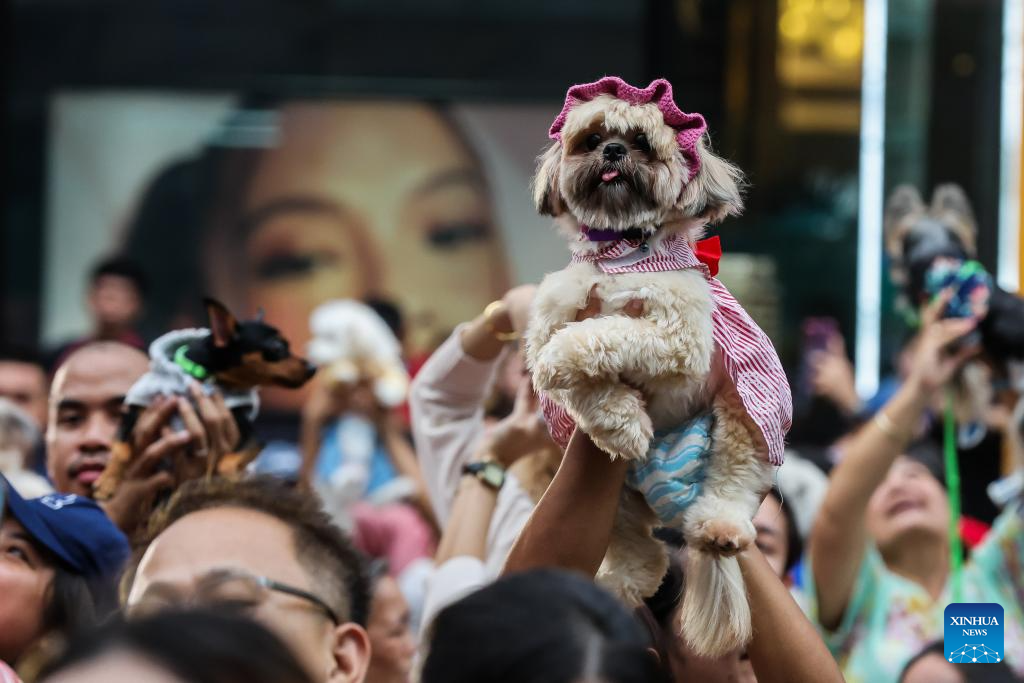 People raise their costumed pet dogs as they participate in a pet parade in Quezon City, the Philippines on Oct. 6, 2024. The pet parade was organized in celebration of the World Animal Day which is observed on Oct. 4 every year. (Xinhua/Rouelle Umali)