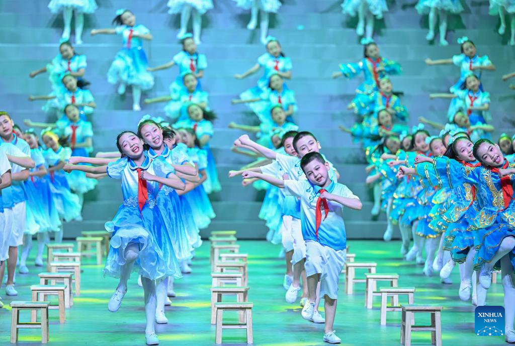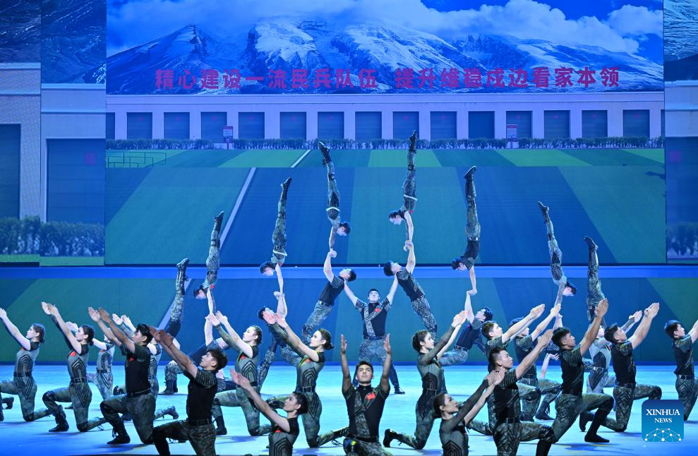 An artistic performance is staged to celebrate the 70th founding anniversary of the Xinjiang Production and Construction Corps in Urumqi, capital of northwest China's Xinjiang Uygur Autonomous Region, Oct. 6, 2024. (Xinhua/Li Xiang)