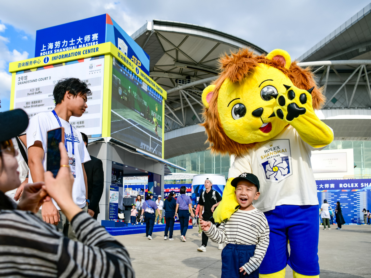 A boy poses with the mascot of the Rolex Shanghai Masters on Saturday. (XINHUA)