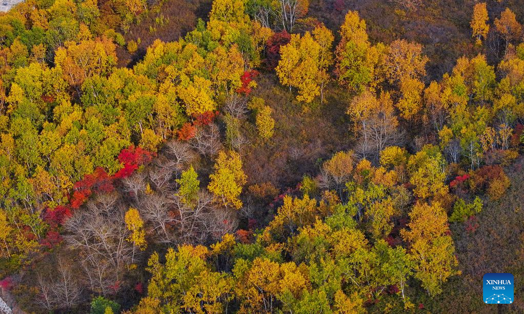 An aerial drone photo taken on Oct. 6, 2024 shows the autumn scenery in Zhuozi County of Ulanqab, north China's Inner Mongolia Autonomous Region. (Xinhua/Lian Zhen)