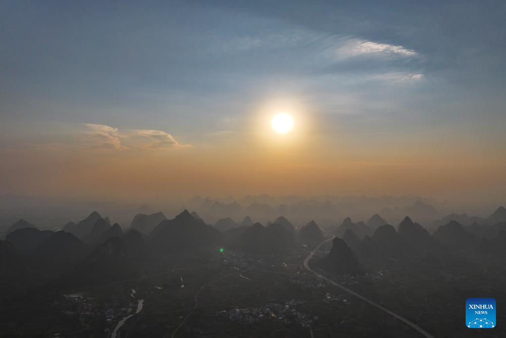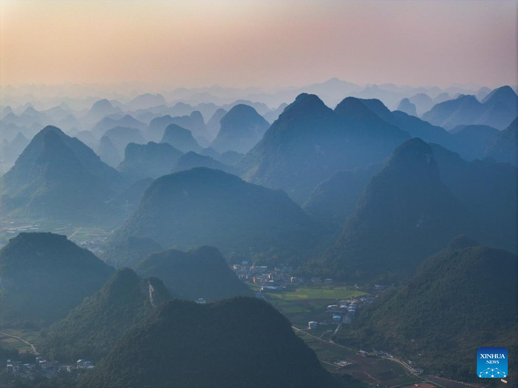 This aerial drone photo taken on Oct. 7, 2024 shows the autumn scenery of a village in Sandu Town of Liujiang District, Liuzhou City, south China's Guangxi Zhuang Autonomous Region. (Xinhua/Huang Xiaobang)
