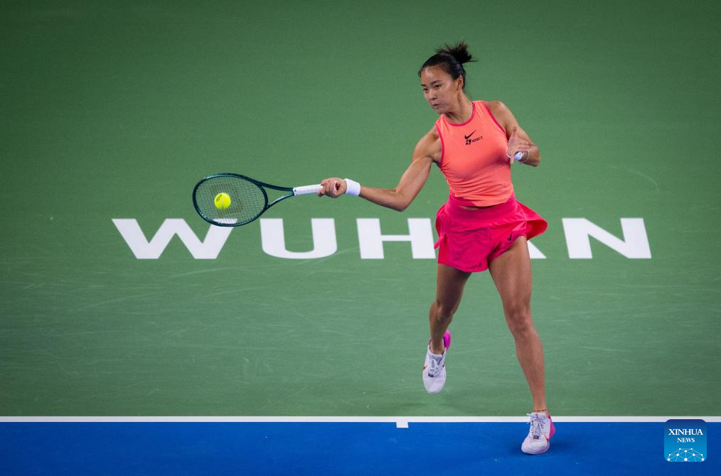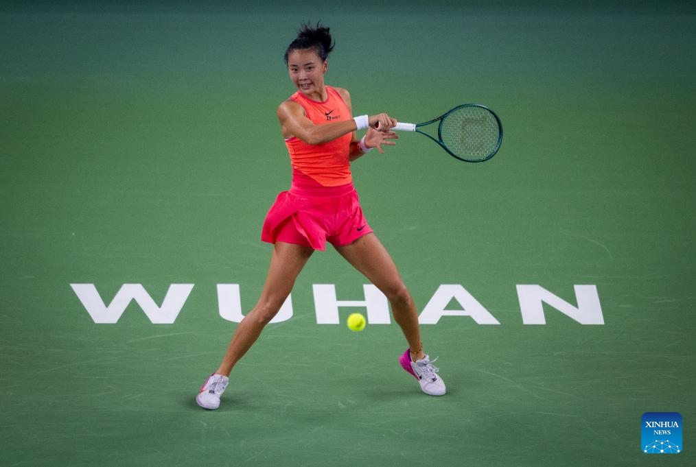 Yuan Yue of China hits a return during the women's singles round of 64 match against Clara Burel of France at the 2024 Wuhan Open tennis tournament in Wuhan, capital of central China's Hubei Province, Oct. 7, 2024. (Xinhua/Hu Jingwen)