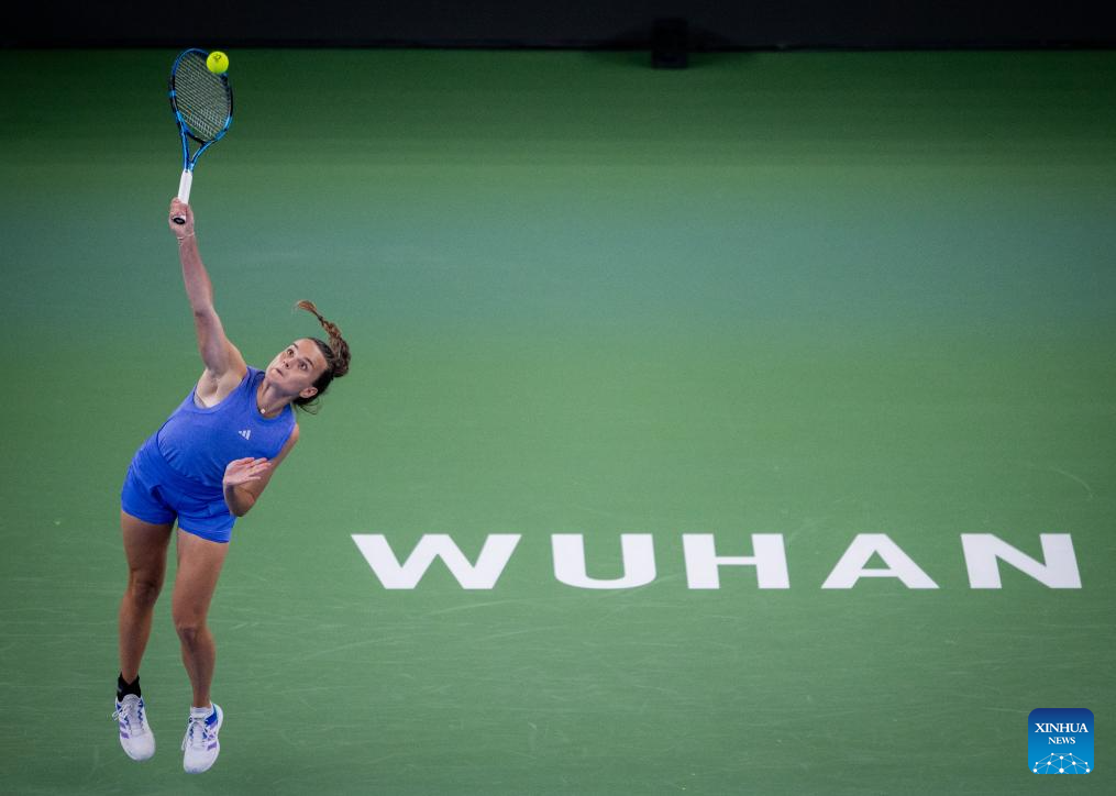 Clara Burel of France serves during the women's singles round of 64 match against Yuan Yue of China at the 2024 Wuhan Open tennis tournament in Wuhan, capital of central China's Hubei Province, Oct. 7, 2024. (Xinhua/Hu Jingwen)