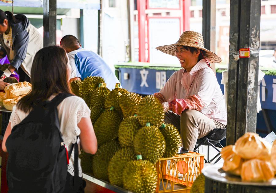 Vietnamese vendors sell durians in Dongxing, south China's Guangxi Zhuang Autonomous Region, on May 18, 2023. (Xinhua/Hu Xingyu)
