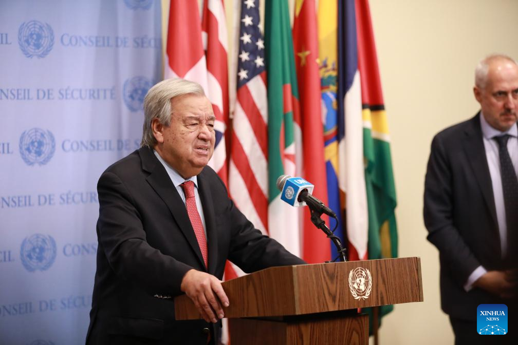 UN Secretary-General Antonio Guterres speaks to the press outside the Security Council Chamber at the UN headquarters in New York, on Oct. 8, 2024. Guterres on Tuesday expressed "profound concern" over Israel's draft legislation that could prevent UNRWA, the UN relief agency for Palestinians, from continuing its essential work in the Occupied Palestinian Territory. (Xinhua/Xie E)