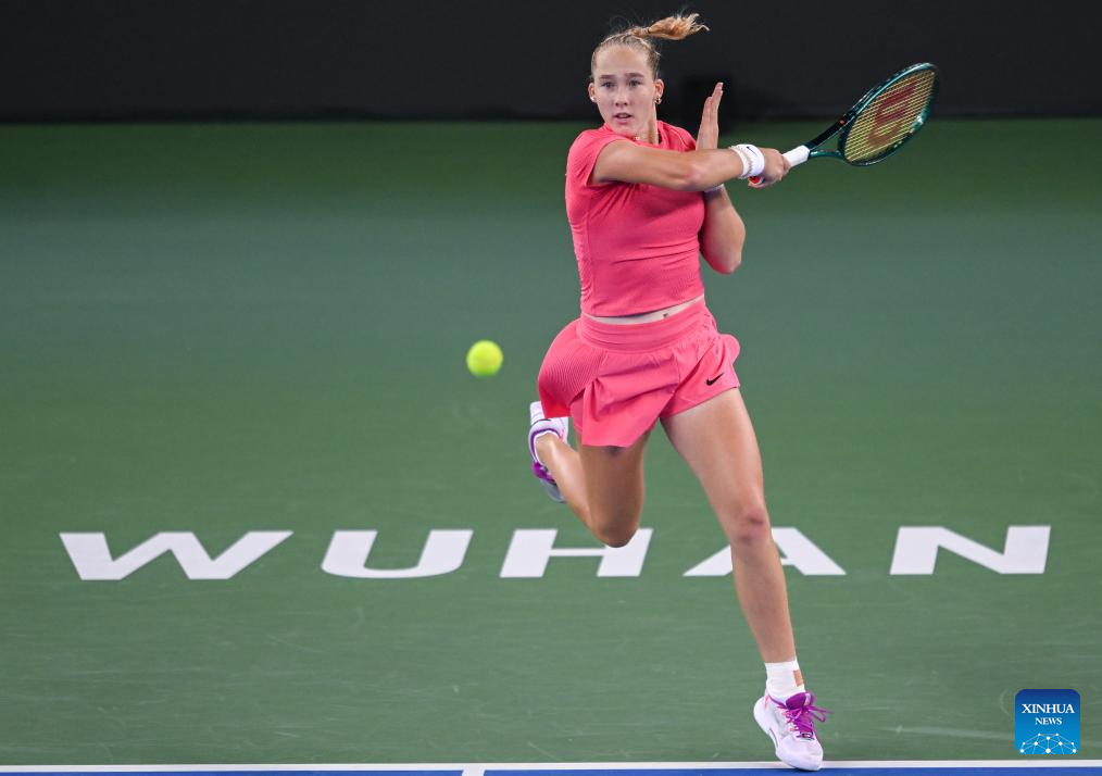 Wang Xiyu of China hits a return during the women's singles round of 64 match against Andreeva Mirra of Russia at the 2024 Wuhan Open tennis tournament in Wuhan, capital of central China's Hubei Province, Oct. 8, 2024. (Xinhua/Wu Zhizun)