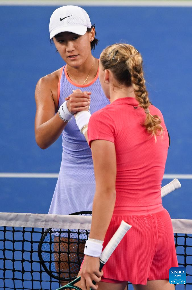 Wang Xiyu (L) of China greets Andreeva Mirra of Russia during the women's singles round of 64 match at the 2024 Wuhan Open tennis tournament in Wuhan, capital of central China's Hubei Province, Oct. 8, 2024. (Xinhua/Du Zixuan)