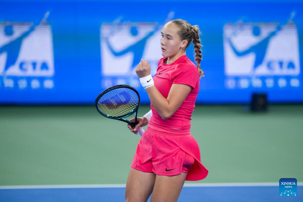 Andreeva Mirra of Russia celebrates during the women's singles round of 64 match against Wang Xiyu of China at the 2024 Wuhan Open tennis tournament in Wuhan, capital of central China's Hubei Province, Oct. 8, 2024. (Xinhua/Wu Zhizun)