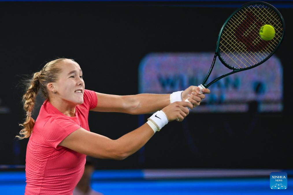 Andreeva Mirra of Russia hits a return during the women's singles round of 64 match against Wang Xiyu of China at the 2024 Wuhan Open tennis tournament in Wuhan, capital of central China's Hubei Province, Oct. 8, 2024. (Xinhua/Wu Zhizun)