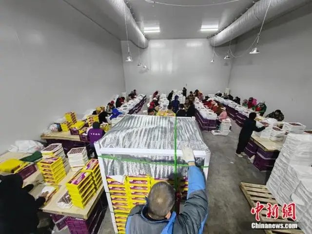 Workers put packed plums in a cold storage facility in Payzawat county, northwest China's Xinjiang Uygur Autonomous Region. (Photo courtesy of the Yuejia Plum Industrial Park and the media convergence center of Payzawat county)