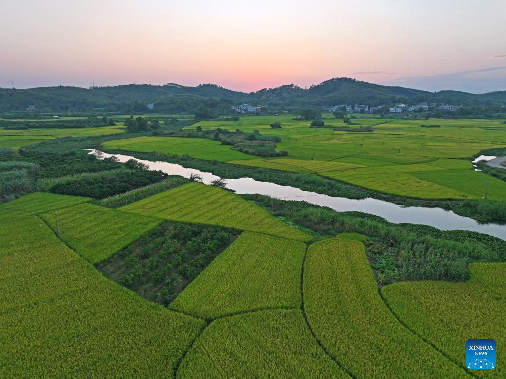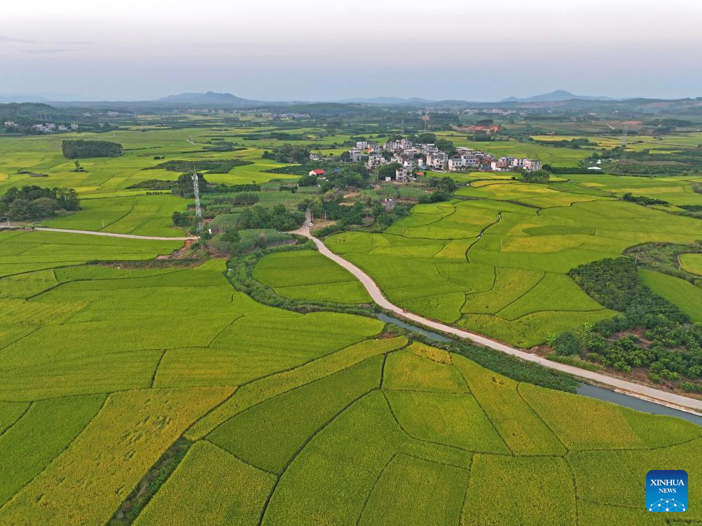 An aerial drone photo taken on Oct. 10, 2024 shows fields in Sicun Town of Xiangzhou County in Laibin City, south China's Guangxi Zhuang Autonomous Region. As a key grain production base in Guangxi, Xiangzhou County's grain sown area reached over 460,000 mu (about 30,667 hectares) in 2024, and the grain output is expected to surpass 160,000 tonnes. (Xinhua/Zhou Hua)