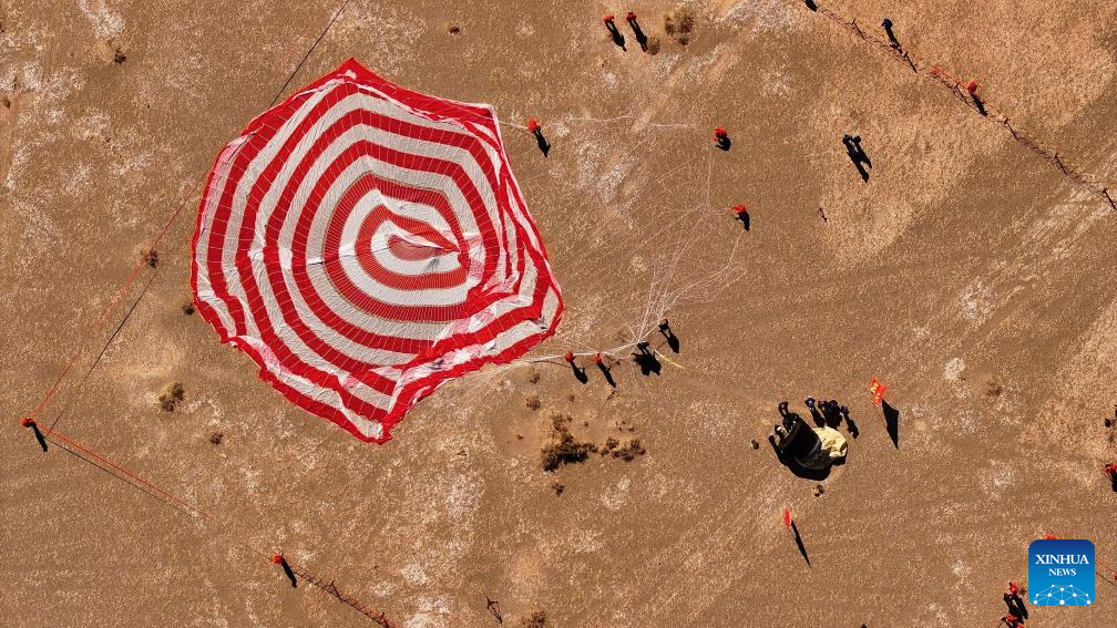 China successfully retrieved its first reusable and returnable test satellite, Shijian-19, at the Dongfeng landing site in north China's Inner Mongolia Autonomous Region at 10:39 a.m. (Beijing Time), Oct. 11, 2024, said the China National Space Administration (CNSA). All the returnable payloads in fields like plant and microorganism breeding, autonomous control and new technology validation, space science experiments, as well as social welfare and cultural innovation, have been retrieved smoothly, said the CNSA. (Photo by Wang Heng/Xinhua)