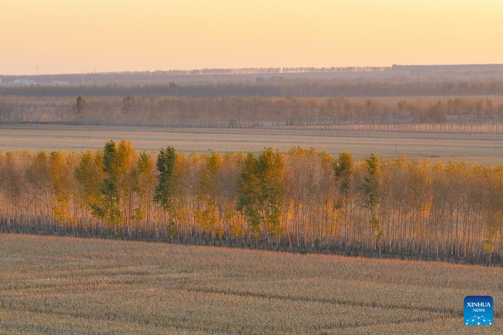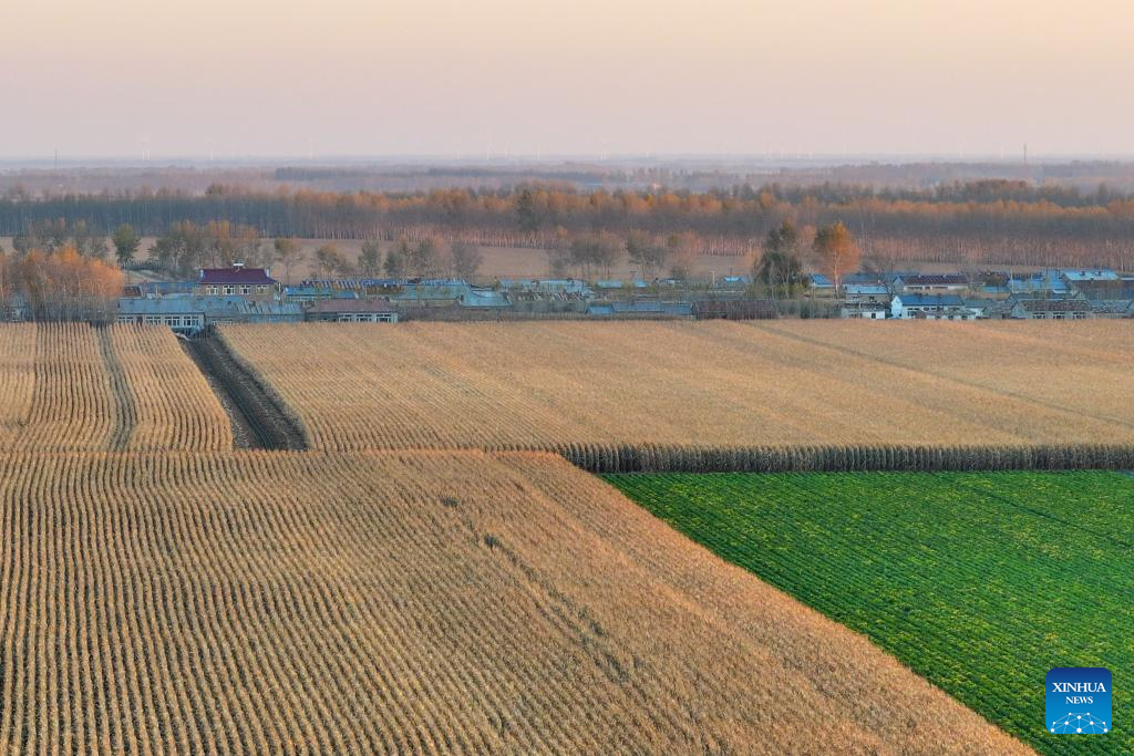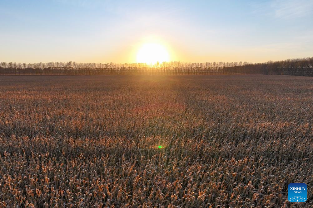 An aerial drone photo taken on Oct. 11, 2024 shows corn fields in sunset in Dongsheng Village, Zhaodong City of northeast China's Heilongjiang Province. (Xinhua/Chen Yichen)