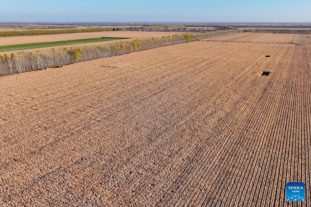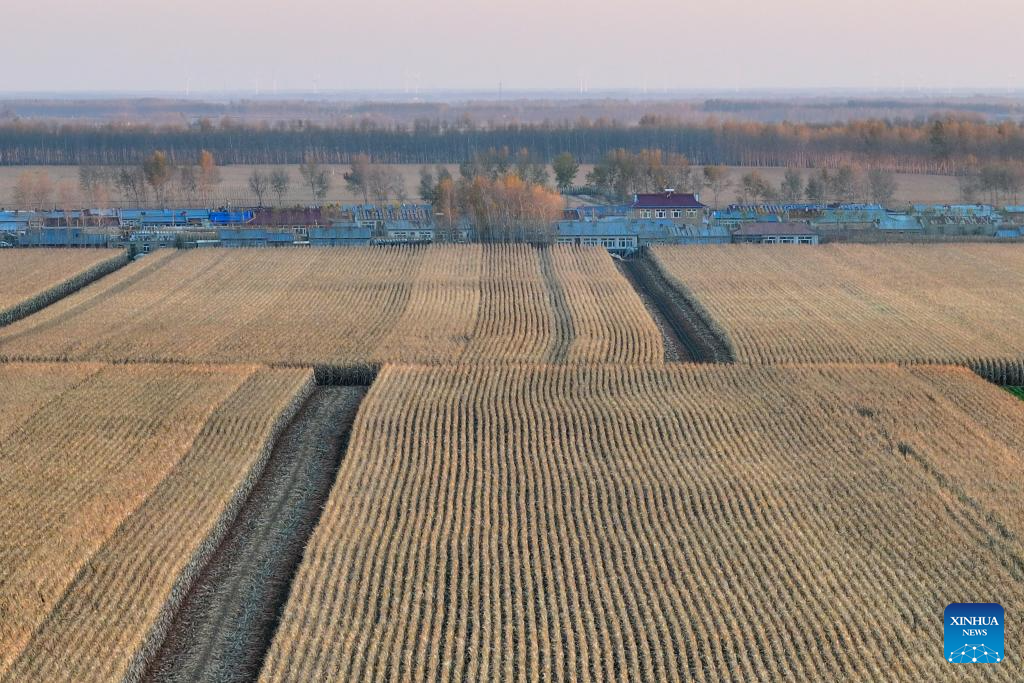An aerial drone photo taken on Oct. 11, 2024 shows corn fields in Dongsheng Village, Zhaodong City of northeast China's Heilongjiang Province. (Xinhua/Chen Yichen)