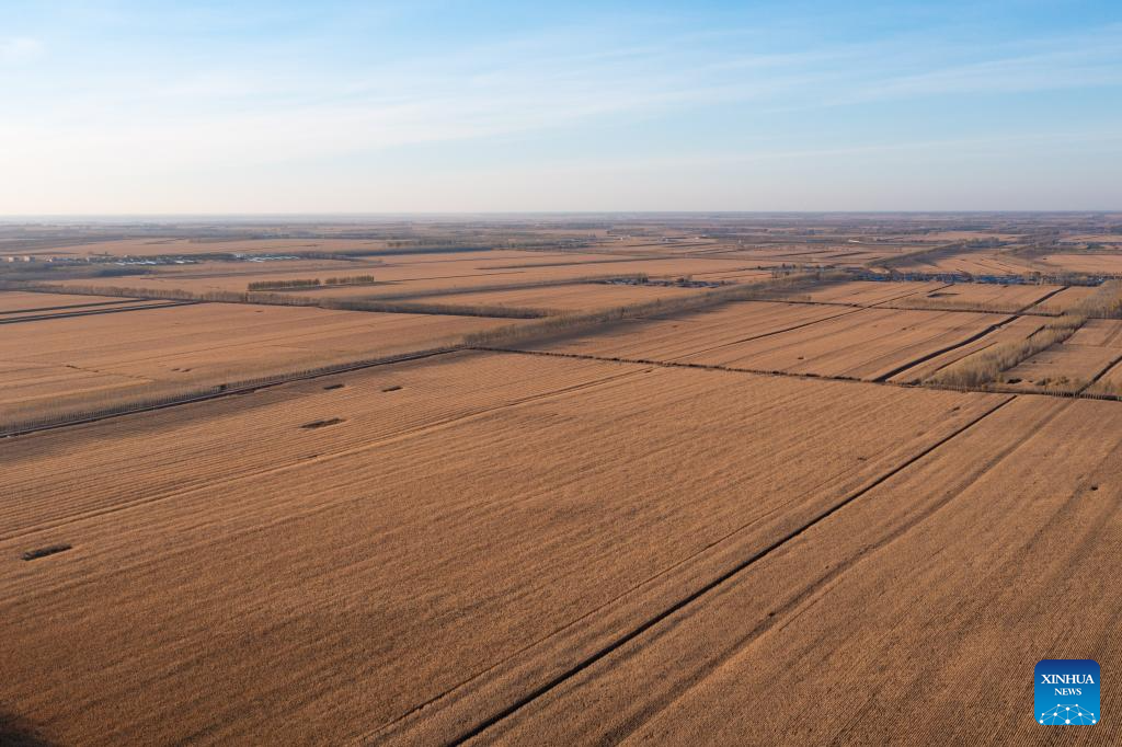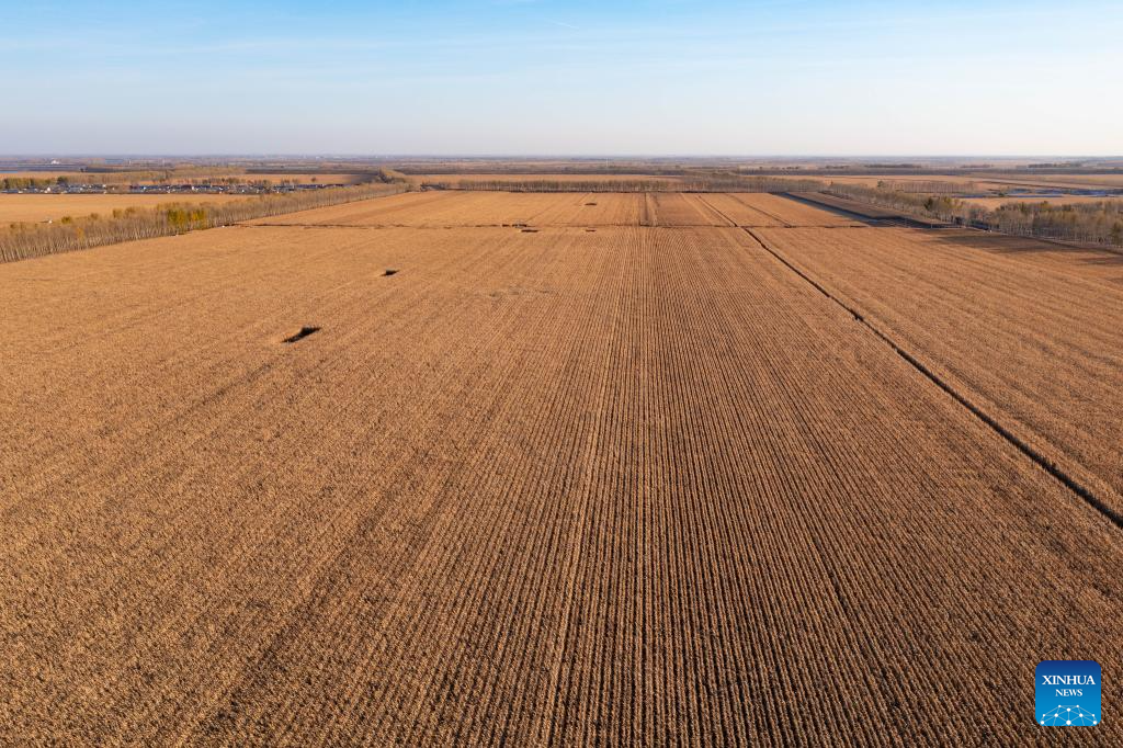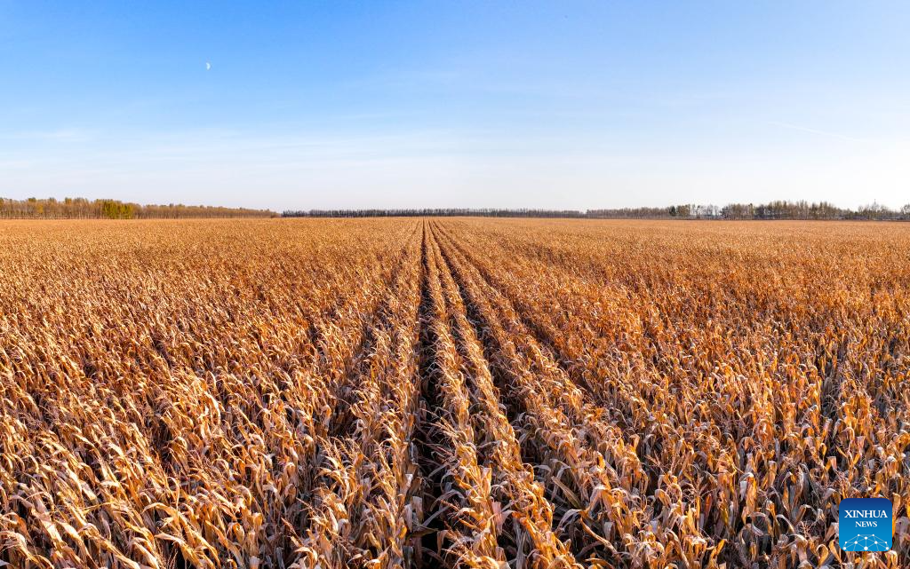 A panoramic drone photo taken on Oct. 11, 2024 shows corn fields in Dongsheng Village, Zhaodong City of northeast China's Heilongjiang Province. (Xinhua/Wang Jianhua)